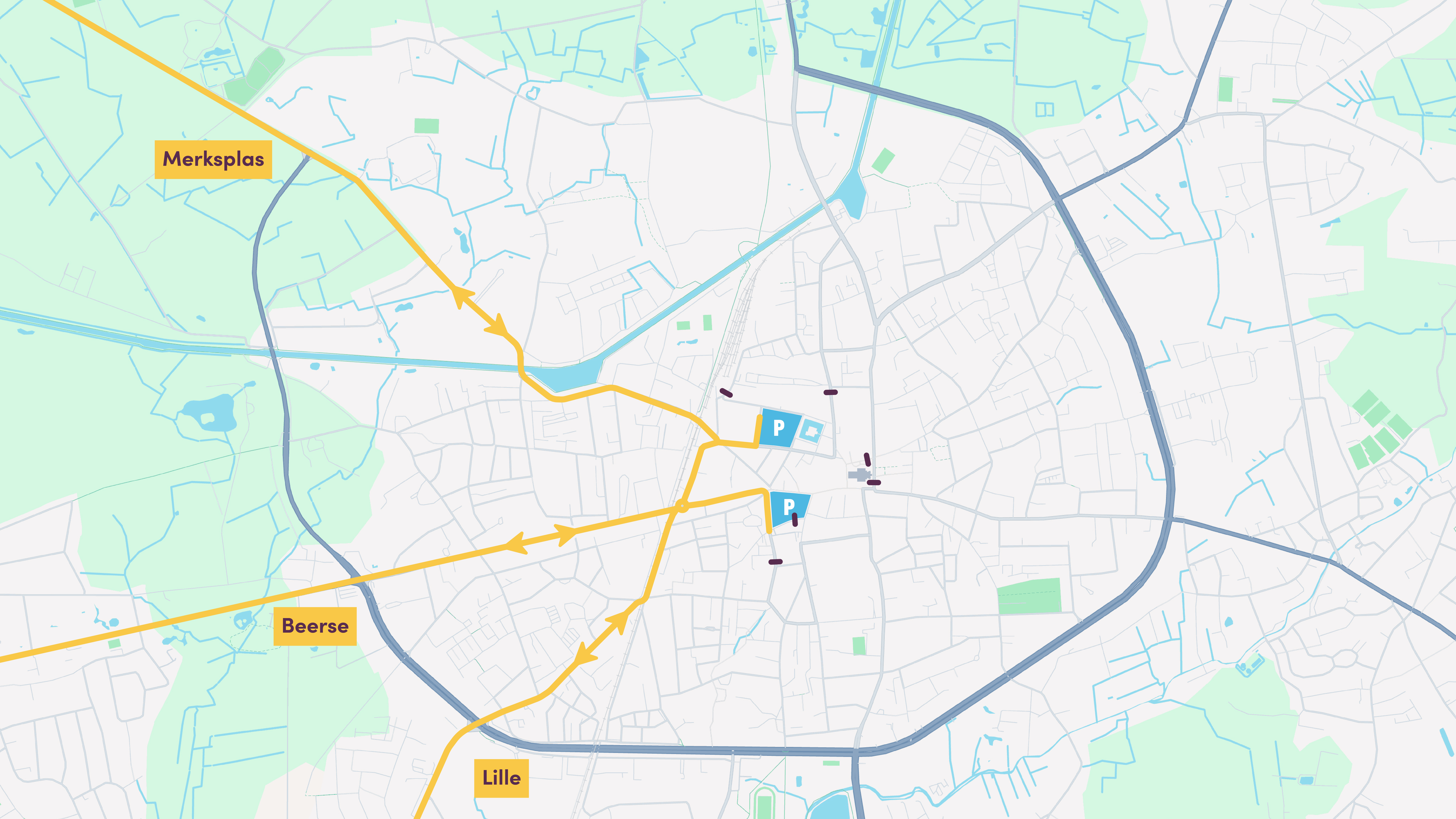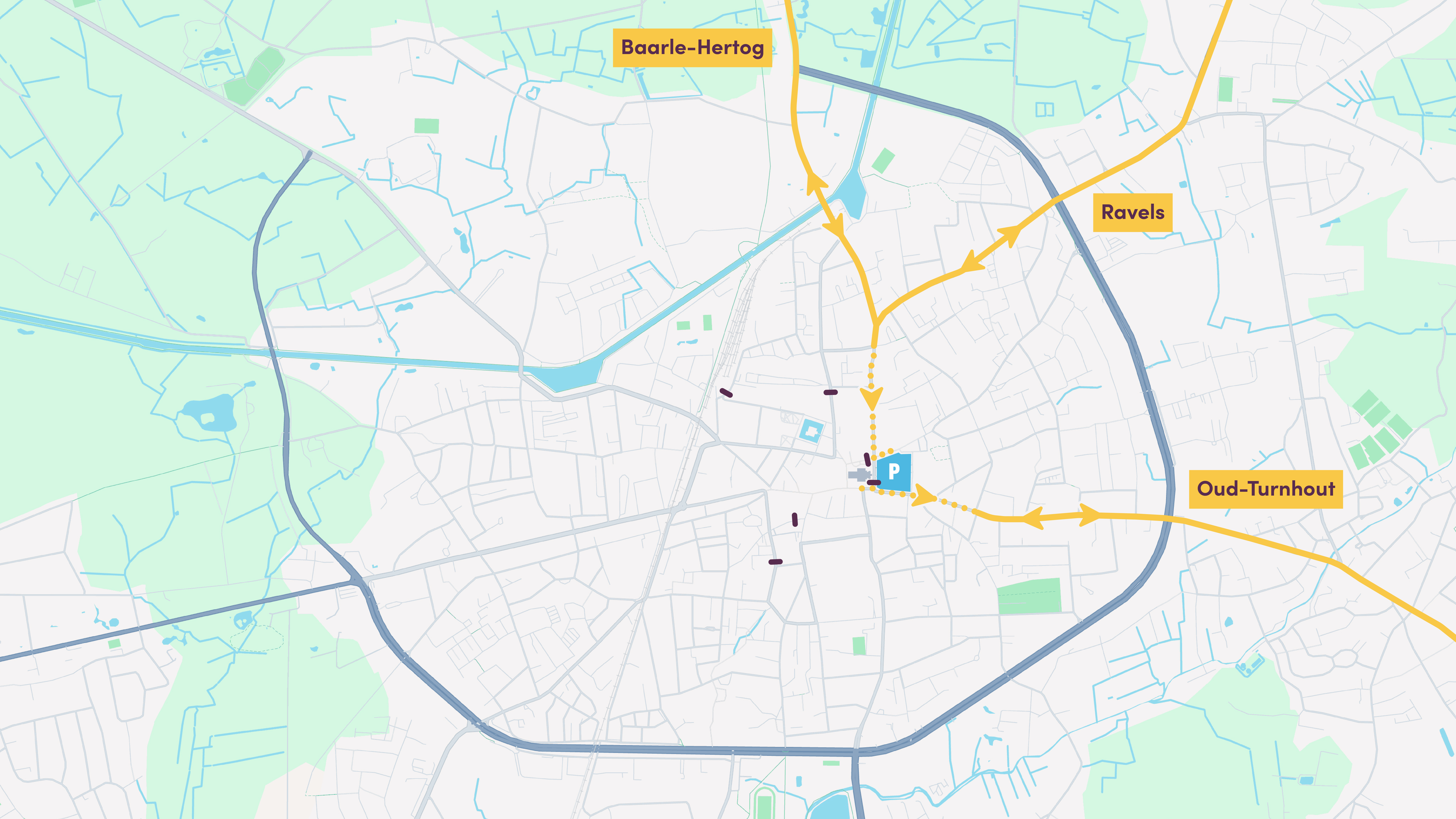 - Je rijdt via de ring naar Steenweg op Oosthoven en Patersstraat tot aan parking Turnova.